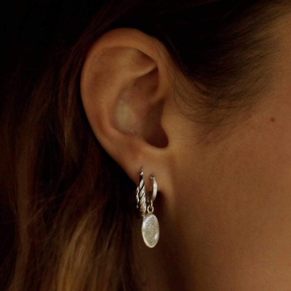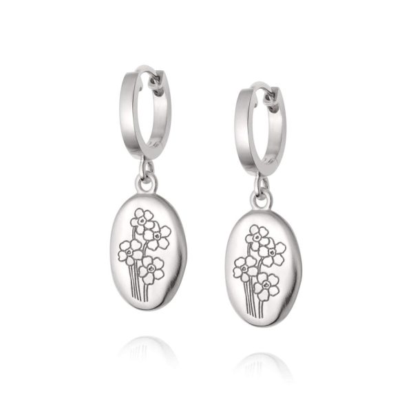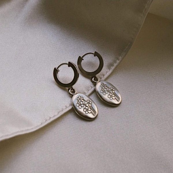 A symbol of memories, these earrings are a forever keepsake. Crafted in 100% recycled sterling silver with a subtle matte finish, the Forget Me Not Drop Earrings feature an oval pendant with a set of etched flowers. Our unique take on a traditional wax seal, hung from chunky huggie hoop.