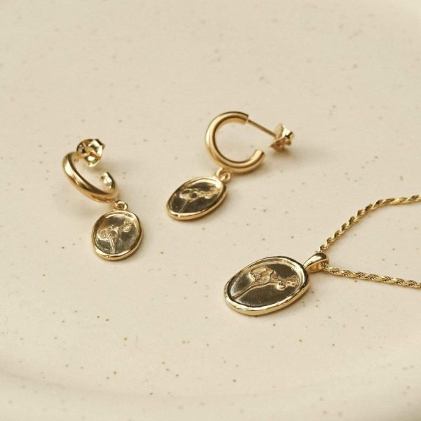 Both delicate and exotic, the Orchid flower is a symbol of love and strength. These drop huggie earrings are handcrafted in 18ct gold plated silver with a subtle matte finish. The Orchid Drop Earrings feature an embossed flower on an organic frame pendant hung from a chunky huggie hoop.