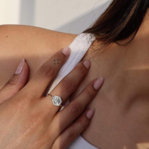 Our modern take on a classic, this statement signet ring has an angled geometric top refined with smooth edges for a masculine vibe. Crafted in sterling silver, the Estée Lalonde Goddess Hexagonal Ring has a carved goddess symbol to empower the wearer.