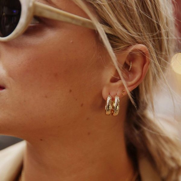 The only hoop earrings you’ll need. The Estée Lalonde Thea Hoops Earrings are the perfect size; crafted in 18ct gold plated silver, they feature a subtle texture all over and can be worn solo or stacked for maximum statement styling.