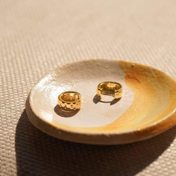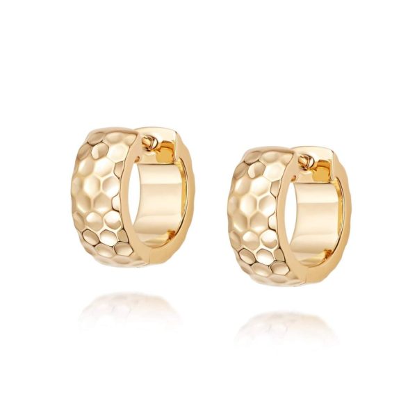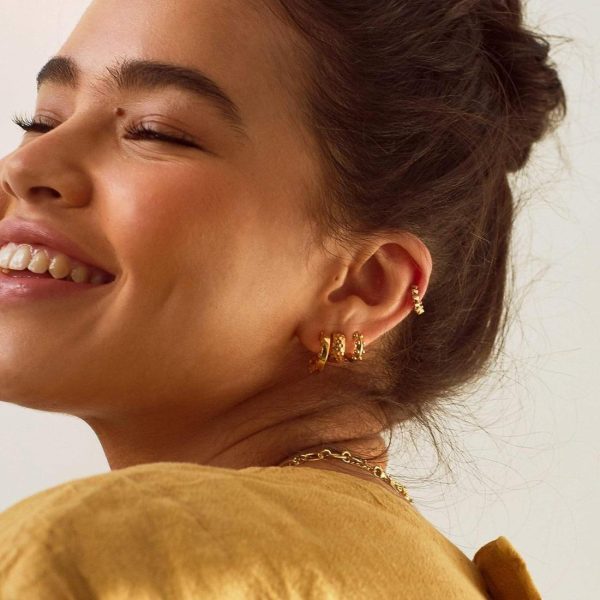 An everyday staple. The Aurora Huggie Hoop Earrings gently hug the earlobe, perfect worn solo for a subtle statement or layered with your favourite hoops for that more is more look. Crafted in 18ct gold plate featuring a repeated hexagonal stamp texture, these huggies are a real head-turner.
