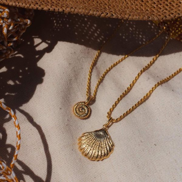 Your new go-to, the Isla Sundial Shell Necklace features a solid, spiral shell hung on a chic twisted rope chain that fastens with an adjustable lobster clasp. This 18ct gold plated silver necklace is the perfect layering piece.