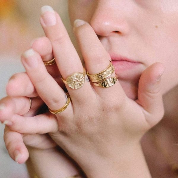 One of those ‘can’t go wrong’ additions to any outfit. Featuring an aztec pattern intricately carved on a beautifully smooth band, the Artisan Stamped Ring has us dreaming of sun soaked streets and busy market stalls. Handcrafted in 18ct gold plated sterling silver this ring is the perfect token of past adventures.